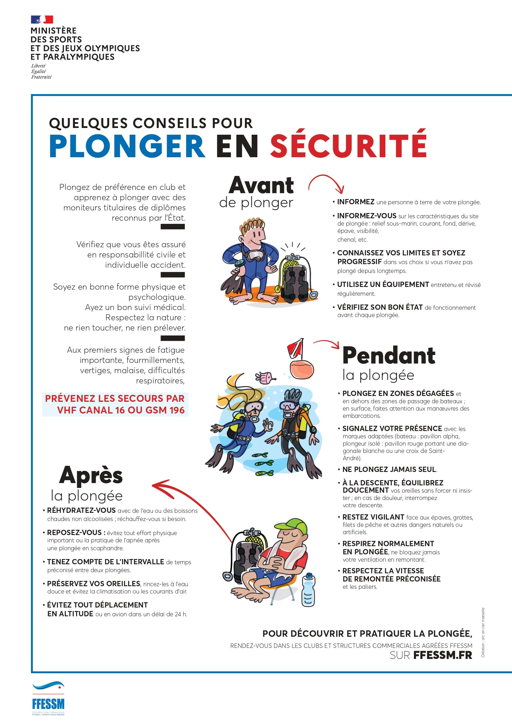 Affiche réalisée par la FFESSM, conjointement avec le ministère des sports, présentant quelques conseils et recommandations pour plonger en sécurité. Des conseils à suivre avant, pendant et après la plongée.